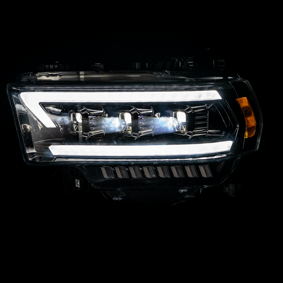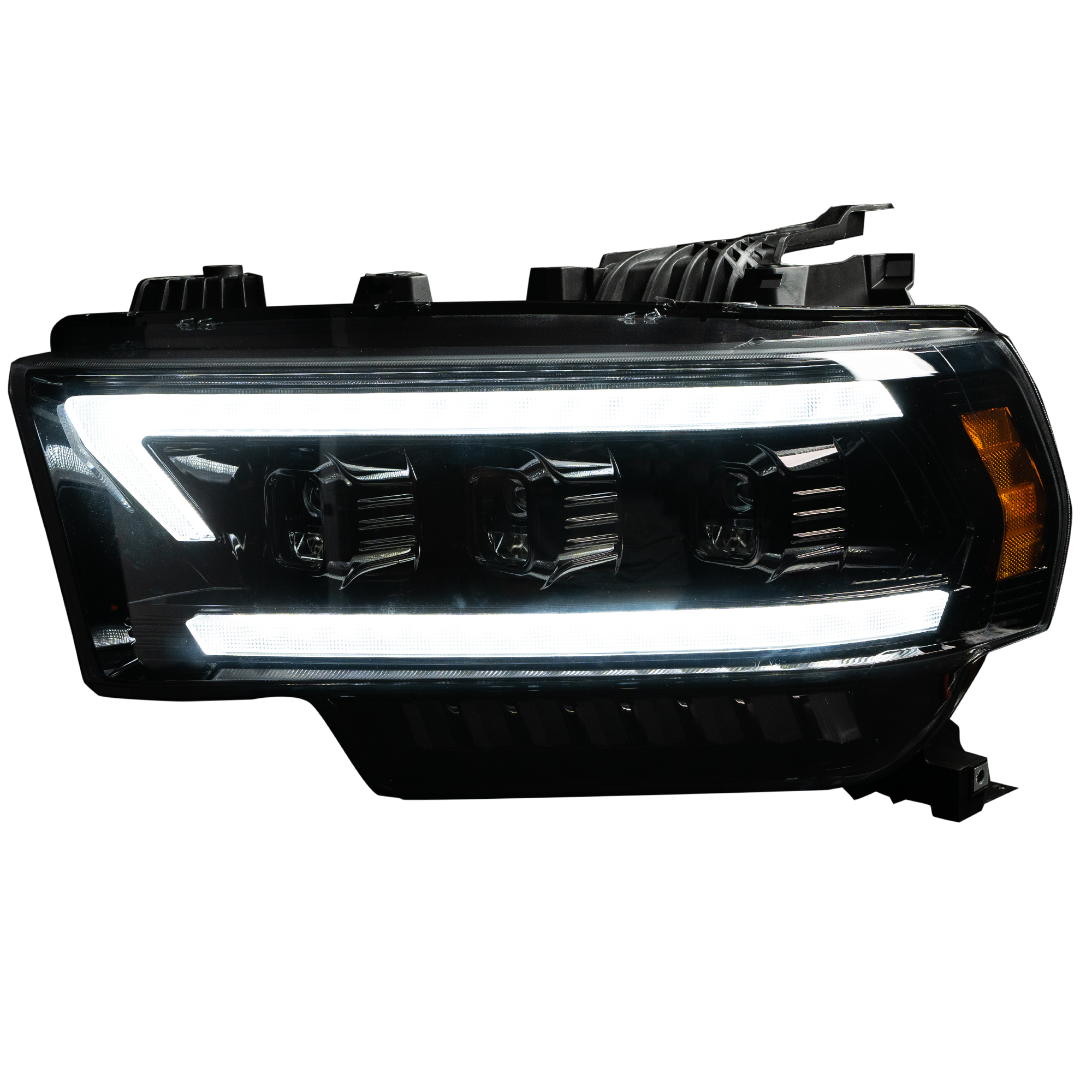 Dodge RAM 19-23 2500/3500 5th GEN Body Style w/ OEM Halogen & Standard Reflector Housing - LED PROJECTOR HEADLIGHTS w/ Ultra High Power Smooth OLED DRL & SCANNING SWITCHBACK High Power Amber LED Turn Signals - Smoked / Black