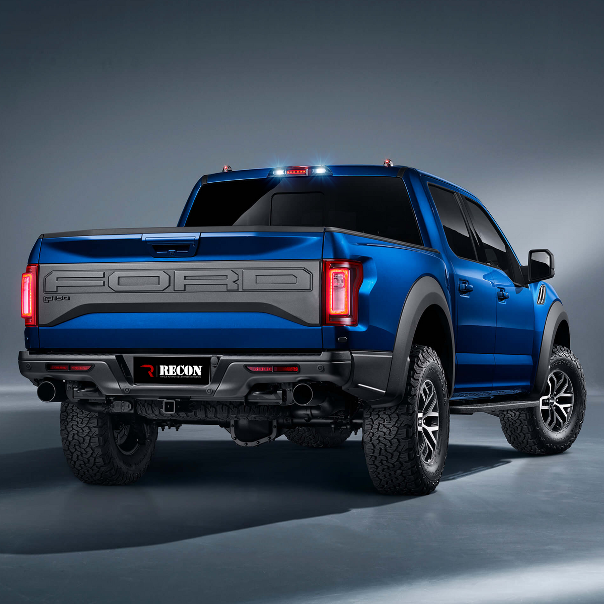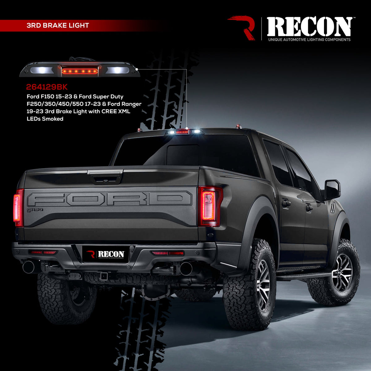 RECON Part # 264129BK - LED 3RD BRAKE - Ford F-150 15-20 F150 & 17-20 SUPERDUTY F250/350/450/550 & 19-20 Ranger - ULTRA HIGH POWER Red LED 3rd Brake Light Kit w/ ULTRA HIGH POWER CREE XML White LED Cargo Lights (Replaces both LED & Non-LED 3rd Brake Light - ATTN: DOES NOT FIT Models which include Cargo Bed Camera in OEM 3rd Brake Light) - Smoked Lens